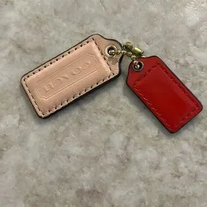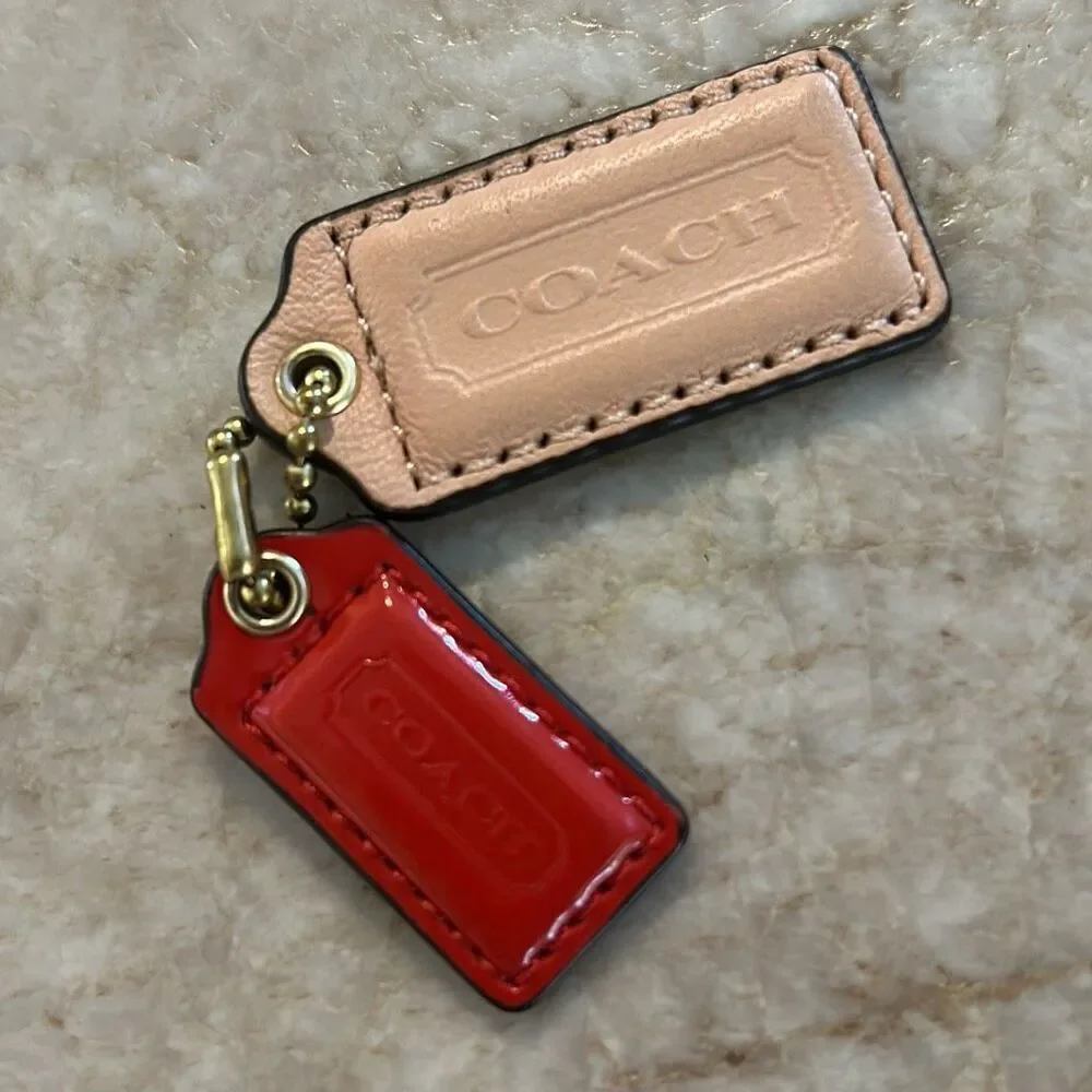 Two coach luggage tags on gold keychain. Smaller tag is orange/red. patent leather and larger tag is a peach matte leather. Measurements in picture.