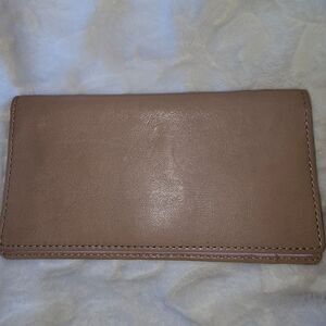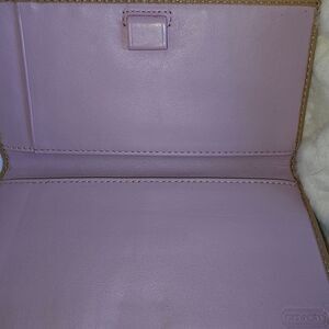 Gorgeous nude colored wallet by COACH. The inside is a beautiful lavender color. In excellent condition. There are two very minor spots on the back, shown in pictures. The length is 7". The width is 3.5".