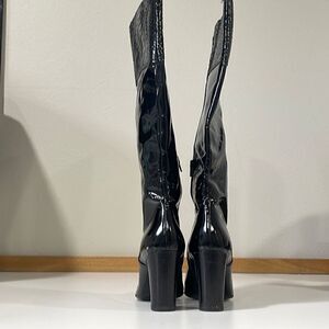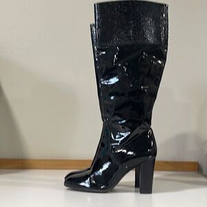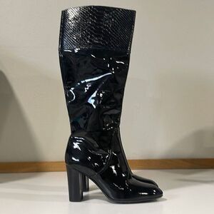 Gently used Coach patent leather boots with snake skin texture at the top. These boots feature a zipper for closure and a thick, comfortable 3.5 inch heel.