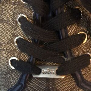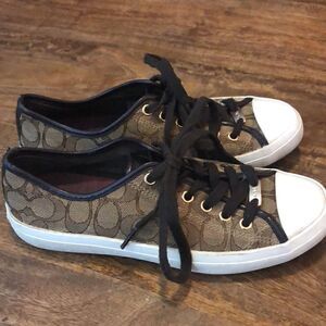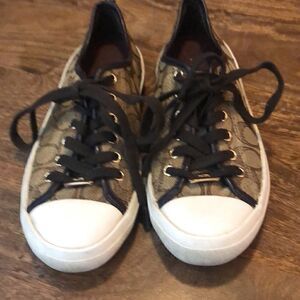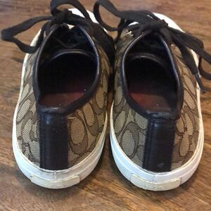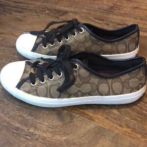 Great preowned condition for vintage shoes. Brown leather trim, signature Coach print canvas, lots of Coach details. Some staining on side rubber soles.