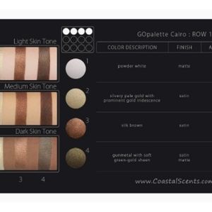 Coastal Scents Go Palette Discover exotic beauty with our Cairo Go Palette. Containing twelve highly pigmented Egyptian themed jewel tone shadows to create an endless array of looks. All twelve shadows are included in our matte black Coastal Scents logo imprinted palette and equipped with a mirror for convenience.