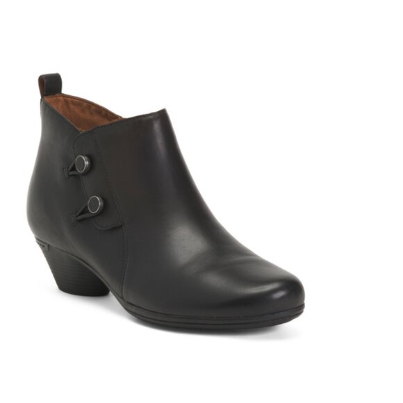 Brand New Color: Black pull on loop, loop and button detail, stacked heel 2in. heel ankle boots 4.5in. shaft height, 13in. shaft circumference, taken from size 9.5M rounded toe, side zip closure leather upper, man made sole imported