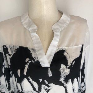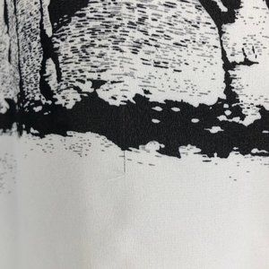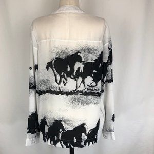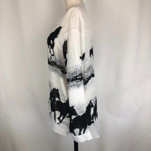 Awesome black and white galloping horse long sleeve tunic. Sheer fabric across shoulders and upper back. No interior labels or tags. Feels like polyester. Used with a small snag (see photos). C.O.C. Clothing Obsessed Company. Might be a size small, see measurements to determine fit.