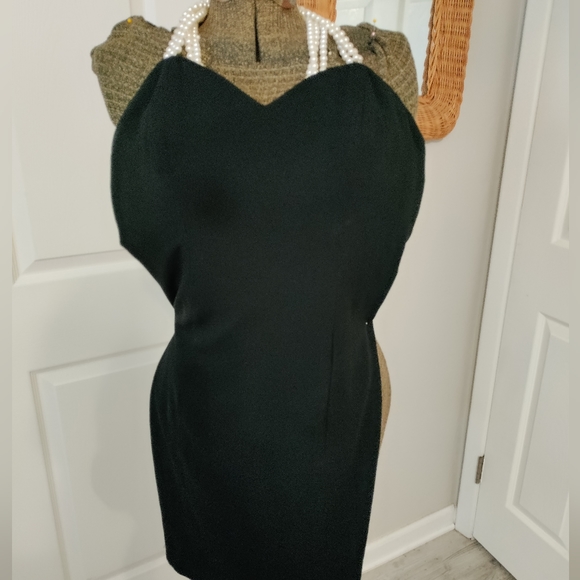 Knee length lined cocktail dress these straps are all poles and criss-cross at the back into a v back with a back zip.