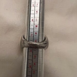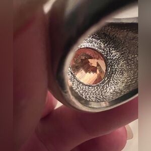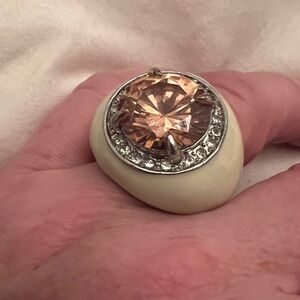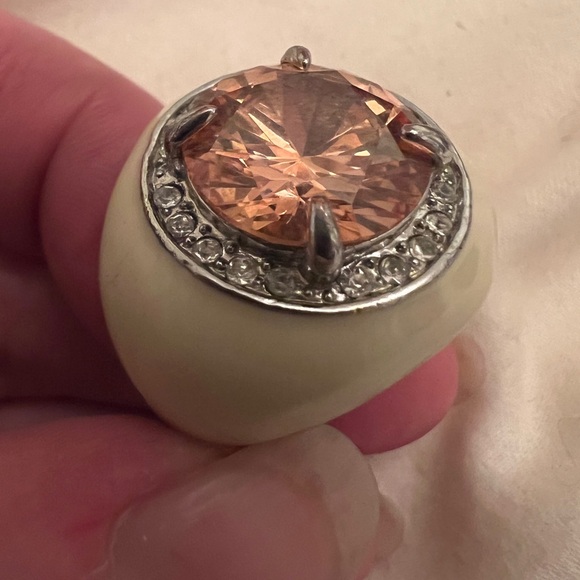Great chunky cocktail ring. Large apricot orange stone with small diamond-like surrounding stones. Silver with cream ivory white enamel. I’ve seen this color listed as morganite and champagne. Band is just over 1/8” at the smallest and 1” width from north to south. About 1.25” from east to west. About 5/8” tall from skin to top of stone. Large stone is about 5/8” wide. My lighting doesn’t do justice, super sparkly!