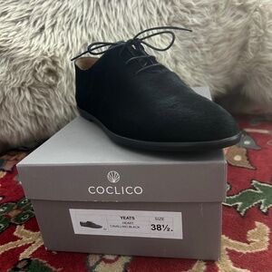 Fans of the Coclico Holmes oxford will recognize this icon of the collection. This update that features a chic new flexible rubber sole and hand painted edging. This oxford flat is simplicity in itself. A vintage man-tailored inspired silhouette, the Yeats adds a cool contrast to summer floral dresses, or pairs off perfectly with a streamlined pair of pants. In luxurious black hair calf. FIT: The Yeats fits true to size.