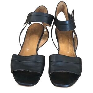 COLICO black leather sandal with block heel. Ankle strap secures with hook and loop. Heel is approximately 2”. Made in Spain. Good pre-owned condition. Most of wear is seen on the outsoles. Heels have a few scuff marks as shown in pictures. Size 37.5 (equivalent to USA size 6.5)