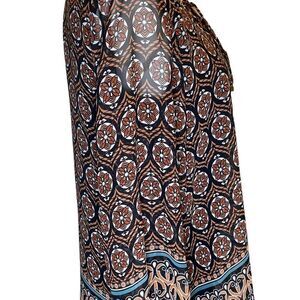 Here we have a stylish Coco Bianco tunic. Size Medium. Blouse has an overall pattern (see photos) in a floral and geometric pattern. Grommets and Laces up at the neck. Sheer Top and its lining are both 100% polyester. Item is Preloved and in good condition. Top measures 24.5” long. Armpit to armpit measures 19”. Brown, black, blue and white in color.