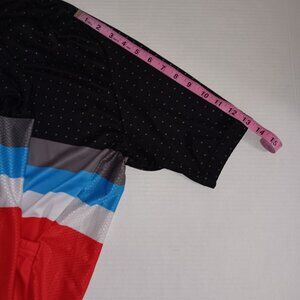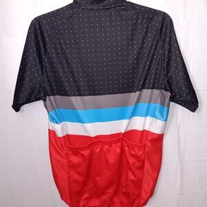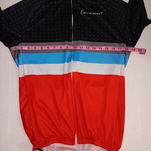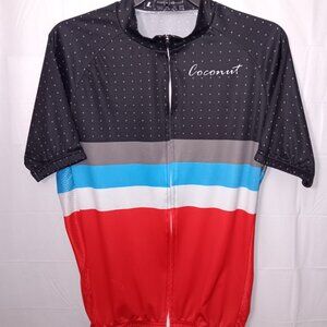 Size Large Men's - COCONUT Black, Gray, Blue and Red Multi color short-sleeved Functional Zipper closure and Functional 3 Back Pockets Also has polka dots and MESH on the sides the Material is 100% Polyester in good pre-owned condition Note Some Wear on the Front as seen in photos and video