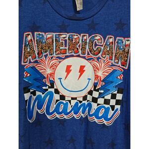 Fun & festive CODE FIVE by LAT Apparel “American Mama” graphic tee. Blue star-print background with bold patriotic design. Cotton-poly blend for comfort & style. Size Large. Gently used & in great condition – perfect for 4th of July, concerts, or casual wear!