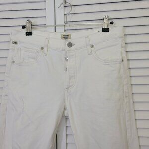 Women's Citizens of Humanity "Emerson" slim boyfriend jean, size 25. I noted two small, faint and hardly noticeable stains - one is on the outer fly, the other is on the front right hip (seen in last two photos). Otherwise, They are in excellent condition showing minimal signs of use.