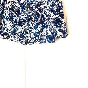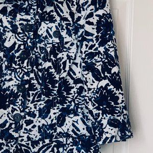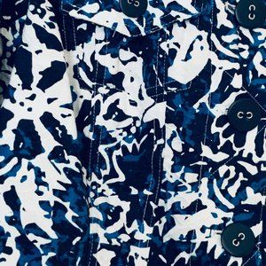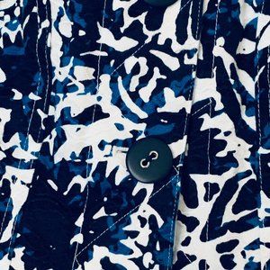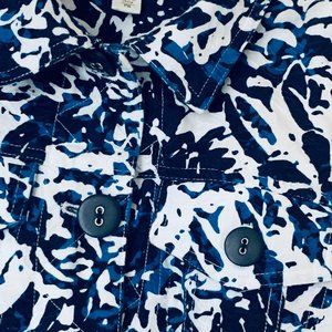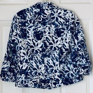 Jean Style with pizazz!. Blue, navy and royal, print on a subtle, white embroidered background.Slightly fitted through the torso just enough to alleviate that boxy look Two top pockets with flaps and lovely blue button matching the front closure. Lots of top stitching on the front and back. 3/4 sleeves and a banded stitched bottom, with a slight contour. All in all, an elevated jean look that will do wonders for the shape of the body.