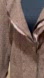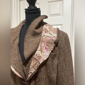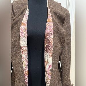 BROWN TWEED PEPLUM JACKET, THREE LAYER RUFFLES COLLAR AND PEPLUM, POLYESTER PAISLEY LINING, AND RUFFLE CONTRAST, TWO LOWER FRONT POCKETS AND ONE LEFT CHEST POCKET, ONE HOOK AND EYE CLOSURE, BUSINESS OFFICE WEAR, NEW WITH TAG.