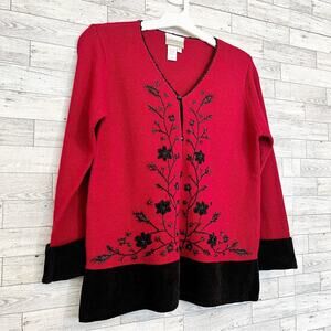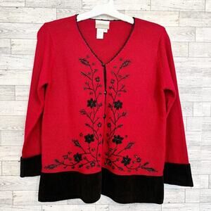 This gorgeous red and black cardigan sweater by Coldwater Creek is a wonderful alternative to a traditional blazer for work or a little something special for after hours. Features a 4 button front closure with long sleeves and folded cuffs. Red knit with soft black chenille border and cuffs. The front is trimmed in beads and chenille to make a pretty floral and vine design. Ramie / Cotton blend, hand wash.