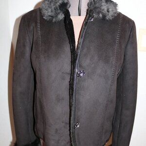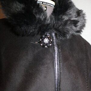 This is Warm, thick, body warmer Coldwater Creek Winter Coat Suede Fur Collar Trim w/ Rhinestone Buttons. Precious black coat with faux suede feel and faux fur lining, collar and cuffs. Decorative stitching on front and back and faux leather trim. Beautiful jewel buttons. Hidden side pockets.