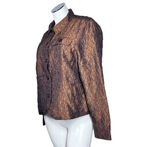 This Coldwater Creek Jacket is a stylish versatile piece to add to your wardrobe. The copper-brown diamond quilted fabric has a distinctive metallic bronze hue that adds a touch of elegance to its appearance. The jacket features a pointy collar, and a button-down front, resembling the classic denim jacket. style. However, the metallic finish and quilted design elevate it beyond casual wear. The crinkled, wrinkle-free, lightweight fabric makes it ideal for travel or busy days when you need to look put-together without worrying about wrinkles.