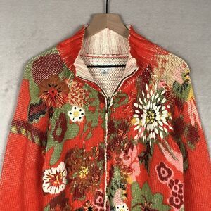 COLDWATER CREEK Embroidered Full Zip Sweater Sz M Orange Printed Floral Cotton