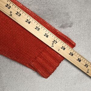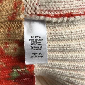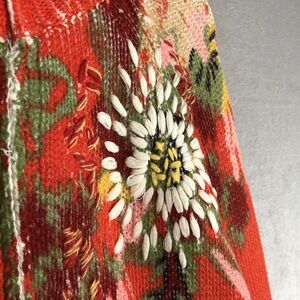 This stylish Coldwater Creek sweater comes in size Medium. It is a tight-knit, long sleeve sweater with a mock neck and full zip closure. The sweater features a vibrant orange and printed multicolor background with embroidered floral accents. The material is a cotton-ramie blend knit.