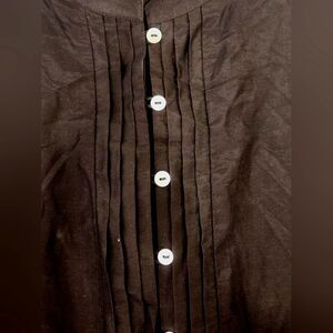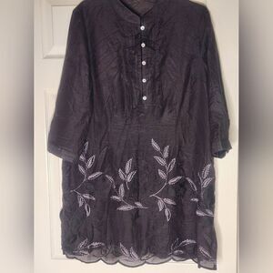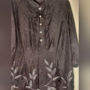 This black silk blend dress from Coldwater Creek is perfect for any occasion. The lightweight fabric makes it ideal for travel, while the metallic embroidered hem adds a touch of elegance for party or cocktail events. The dress features a collared neckline, button closure, and 3/4 sleeves, making it versatile enough for casual wear as well.