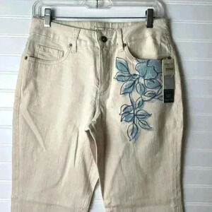 COLDWATER CREEK Pants Beige with Embroidered Blue Painted Florals Size 8 P