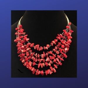 5-strand clear wire necklace; multiple faux red raw carnelian beads, in various sizes, are hung from each strand; 16.5" length with a 3" extender; silver-tone lobster claw clasp.