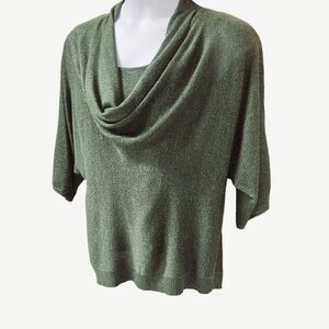 You're purchasing a new without tag women's 3/4 sleeve Sage Green With metallic thread Shimmer cowl neck blouse. Has a tank top underneath blouse