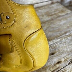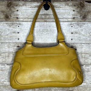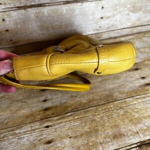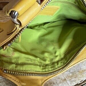 COLE HAAN LEATHER MARIGOLD YELLOW SHOULDER BAG WITH TO HANDLES. FEATURES ONE EXTERIOR SMALL MAGNETIC CLOSURE POCKET AND ONE EXTERIOR ZIPPER CLOSURE POCKET. LINED ON THE INSIDE WITH SIDE CLOSURE ZIPPER POCKET. MAIN COMPARTMENT IS ALSO ZIPPER CLOSURE. DOES SHOW SOME SIGNS OF NORMAL WEAR. INSIDE LINING HAS BEEN CLEANED BUT WOULD BENEFIT FROM A GOOD SCRUBBING. PLEASE FEEL FREE TO SEND OFFERS.