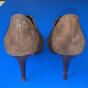 GOOD PRE-OWNED CONDITION EXCEPT FOR BLACK SPOT IN SUEDE ON UPPER BACK OF LEFT SHOE.
