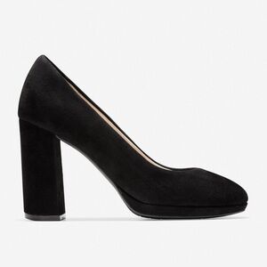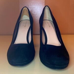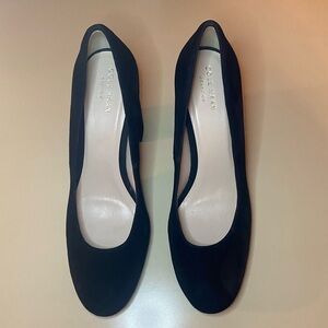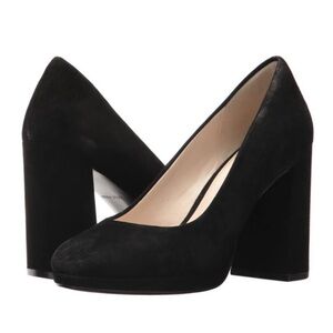 Excellent condition! Smooth suede upper. Fully lined and with foam cushioning in heel. Synthetic leather outsole with flex grooves. Rounded toe. 3.5 inch heel.
