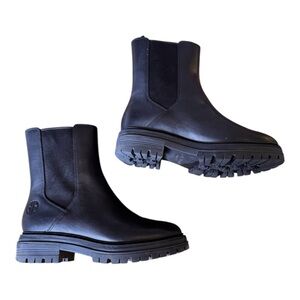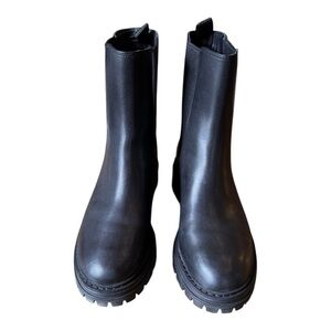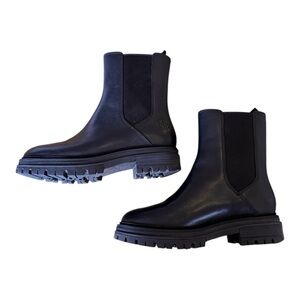 Rich leather Chelsea boots flaunting tone-on-tone detailing mounted on a lugged rubber sole.