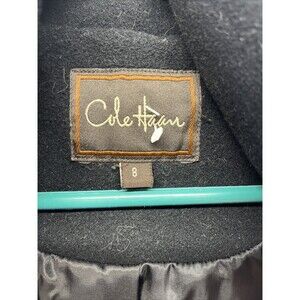This is a black Cole Haan wool blend pea coat in size 8 for women. It features a shawl collar, long sleeves, a mid-length cut, and a belted closure. The coat is designed in a solid pattern with a cashmere lining for added warmth and style. Perfect for casual occasions in the winter, fall, and spring seasons.
