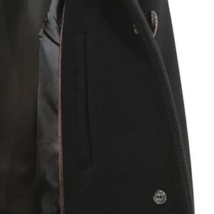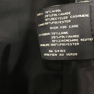 Beautiful black almost new Cole Haan coat with flap and two side pockets, secret inside pocket, wide collar, beautiful hidden buttons and back slit. Coat is a blend of wool, cashmere and polyamide. Coat has structured fit in waist and shoulders. Approximate Measurements: Chest 40”, Waist 36” (buttoned up), Length 38.5”, Sleeve Length 25” (from top shoulder seam to sleeve end). In excellent condition. Please check your measurements to make sure it is the right fit for you.