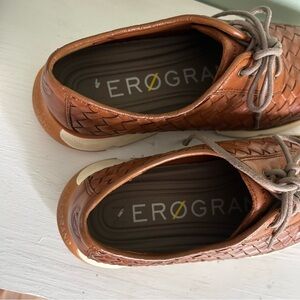Originally $300. Excellent condition, one small untreated water stain on toe. Step out in style with these elegant brown woven leather shoes. Perfect for any occasion, they offer both comfort and sophistication.