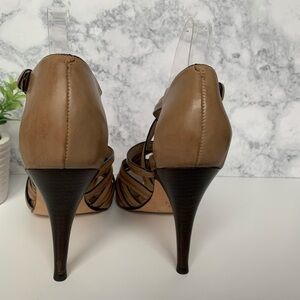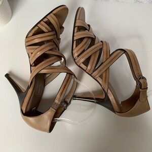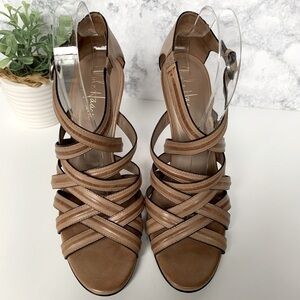 Gorgeous Cole Haan Nike Air tan leather strapy heels. Excellent condition with only signs of wear on bottom and tiny scuff on heel. Hard to notice(see photo). Features a leather upper with an open toe and crisscross straps for full support. Stacked 4” heel and Nike Air technology. Ankle strap with buckle closure. Leather outsole lasting traction and wear.