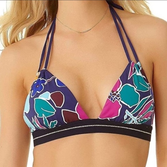 Bright floral and fun!! Floral leafy pattern with wide waist and bust bands accented with a gold stripe. Double strap triangle top with a tassel tie can be tied in various ways and has hook loop bra like back closure. Removable light padding. Hipster bikini bottom has a ruched back to show off your bum and an elastic waistband.