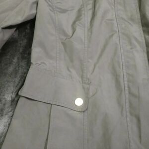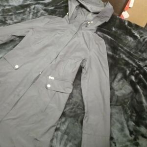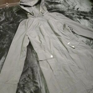 lightly loved cool hand signature style jacket with packable hood size large has tie string in mid-back very cute has one imperfection on right under back of arm it is a drop of super glue but cannot see it when it is on.