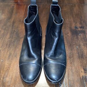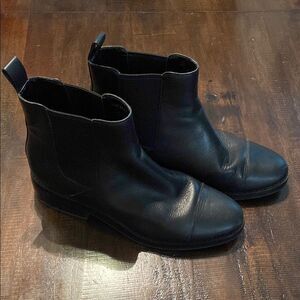 These Cole Haan boots feature a sleek black leather design with a minimalist aesthetic, perfect for both casual and formal occasions. The ankle-height boots offer a slip-on style for easy wear, complemented by a sturdy sole and a slight heel for added comfort and support. Crafted from smooth leather with a matte finish, they provide a versatile and professional look.
