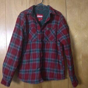 Men's Medium Coleman button up jacket is plaid with two front chest pockets with button closure and two side pockets. The outer shell is made of 100% cotton and the sherpa lining is 100% polyester. The lining is gray.