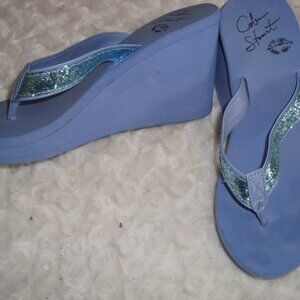 These are a cute platform wedge flip flop sandals with the sparkle blue. Only wore a few times. Size 5. The size tag has been removed but these were mine and I wear a 5.