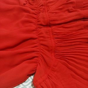 Chiffon red dress w/ beautiful attention to detail. Scoop neckline. Ruched sheer tulip sleeves. Cinchable drop waist. Pleated layers w/ scalloped sides.