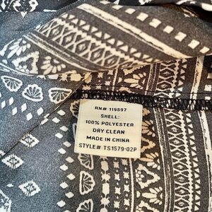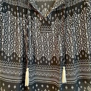 COLLECTIVE CONCEPTS, BOHO LIGHTWEIGHT, SHEER PEASANT TOP. STITCHING AT FRONT SHOULDERS. STRING & TASSEL TIES. NAVY BLUE & WHITE. HI LOW BOTTOM. 3/4 SLEEVE. SIZE MP