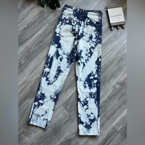 Stylish bleach splatter jeans with a unique pattern. Perfect for a trendy look.