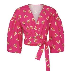 This melon-printed puff sleeve crop top from Color Me Courtney is an instant mood-booster in a flattering wrapped silhouette.