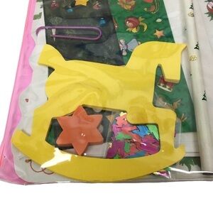 Includes 5 sheets Christmas letter paper, 3 white envelopes, 1 Christmas Pencil, 2 mini sheets of Christmas stickers, 1 star eraser, 1 small bag of bunny rabbit shape rainbow confetti and 1 Rocking Horse Shape cut out pad all in a pink plastic pouch.