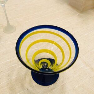 This glass vase/whatever is 4 1/2 inches in Height and 5 inches wide. The colors are a vivid royal blue and lemon yellow in a swirl pattern.