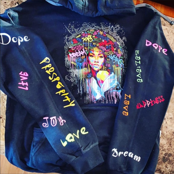 Custom vibrant colorful QUEEN wearing her vivid thoughts on her sleeves ... Available in t-shirts (short and long sleeves)/ HOODIES & SWEATSHIRTS/OFF THE SHOULDER SWEATSHIRTS in MOST COLORS