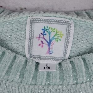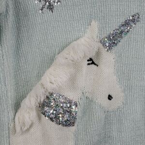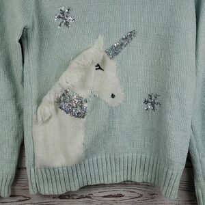 COLORTREE Long Sleeve Winter Sweater Size L (14) in a light teal color and the softest material ever. The sweater has silver sequined snowflakes with a unicorn that has fringe for her mane. Excellent condition. Nor rips or snags.