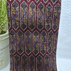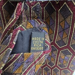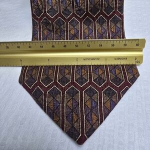 Elevate your style with this sophisticated geometric patterned tie. Featuring rich burgundy and gold tones, it's perfect for any formal occasion.