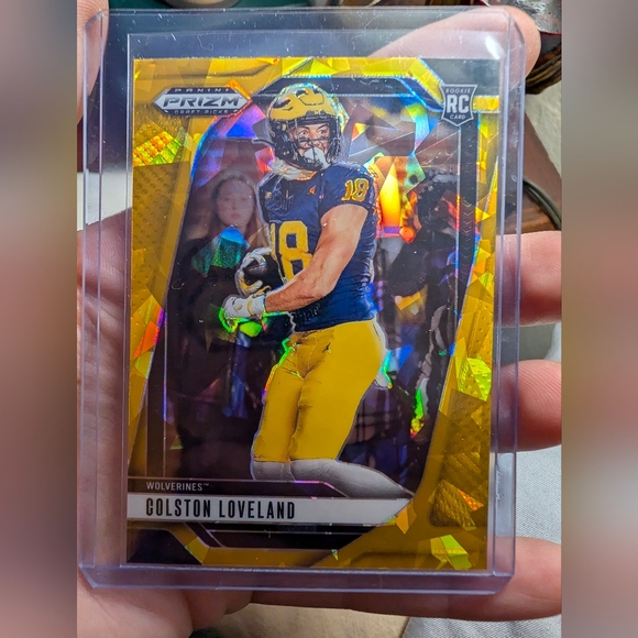 The product is a 2025 Panini Prizm Draft Picks Gold Cracked Ice #67 trading card featuring Colston Loveland, a rookie player from the Michigan Wolverines football team. It is an original card manufactured by Panini, made of card stock and officially licensed by the National Collegiate Athletic Association (NCAA). The card is a special parallel variety with a unique design, perfect for collectors looking to add a rare and valuable piece to their collection.