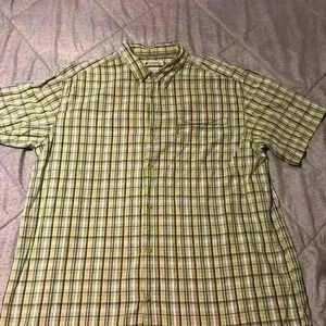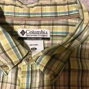 COLUMBIA Button Up Shirt Men XXL 2XL ShortSleeve Beige Yellow Brown Plaid Casual